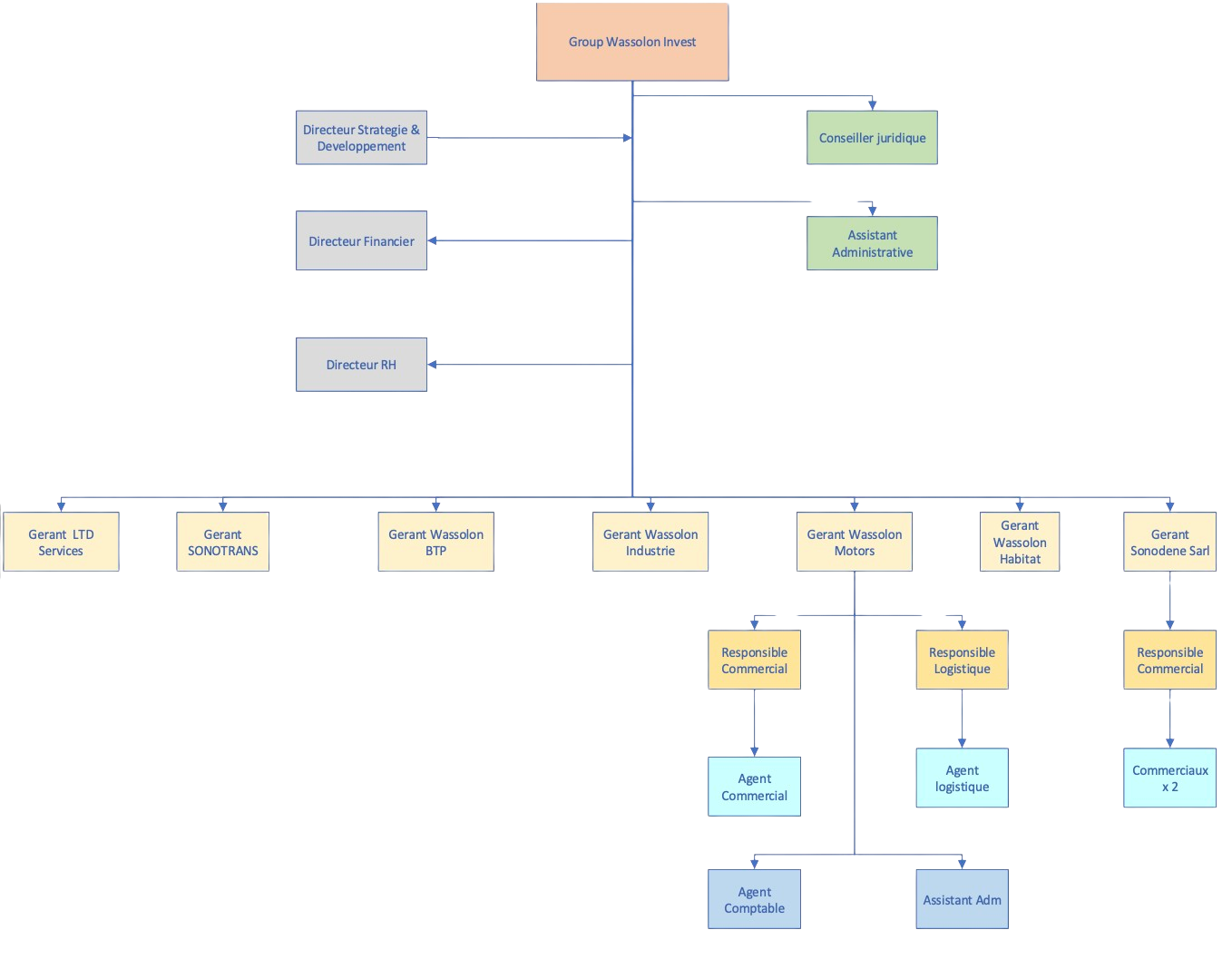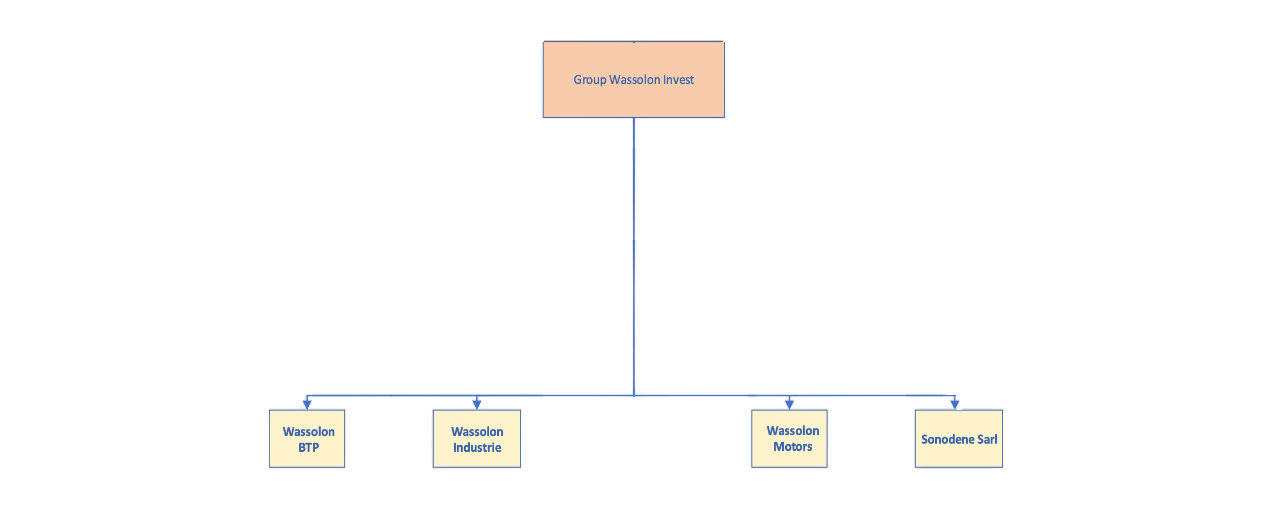 Le « Groupe Wassolon – Invest » est une société anonyme avec conseil d’administration conformément aux dispositions de l’acte uniforme relatif au droit des sociétés commerciales et du groupement d’intérêt économique. La société est dirigée par un président-directeur général et les membres du conseil d’administration sont :