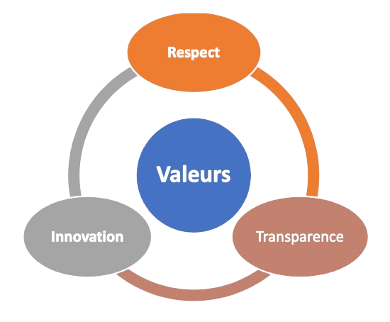 Pour ce faire, nous avons bâti une charte de valeurs qui sont les piliers d’amélioration de notre productivité et notre rentabilité. Ces valeurs qui sont le fondement de notre culture d’entreprise sont le Respect, Innovation et Transparence.